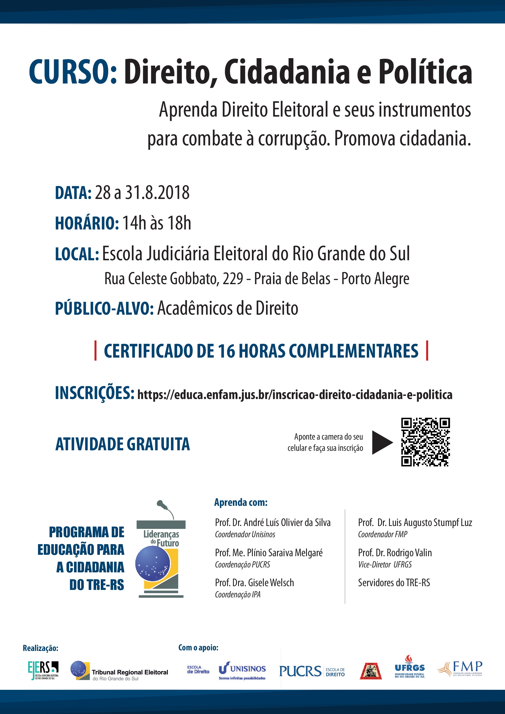 A Escola Judiciária Eleitoral do Rio Grande do Sul (EJERS) promoverá a primeira turma da primeira edição do Curso "Direito, Cidadania e Política", cujo público alvo são acadêmicos de Direito (público externo, exceto estagiários da Justiça Eleitoral), realizado em parceria com algumas das principais instituições de ensino da Grande Porto Alegre.