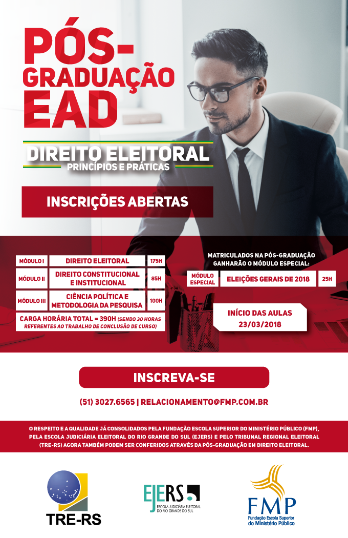 Com 175 horas, consiste no Módulo I do “Curso de Especialização em Direito Eleitoral”, promovido pela FMP em convênio com o TRE-RS.